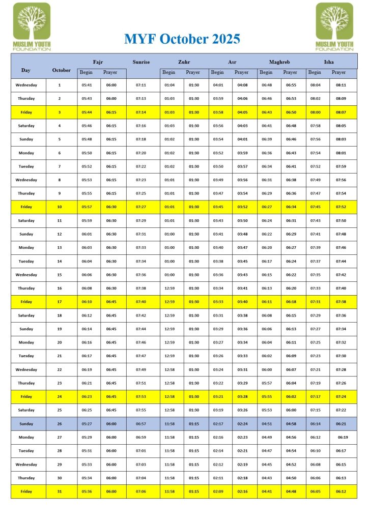 Muslim Youth Foundation > News > MYF News > Myf October Prayer Timetable 2025